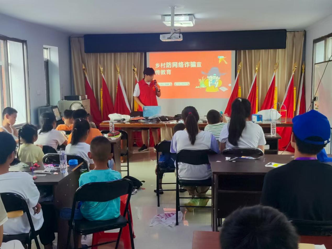 儿童是乡村的未来。实践团首先通过村党支部杨书记的支持帮助,在村委会活动室举办了一场乡村在智能化时代的网络安全宣传教育活动。随着科技的进步,一些网络诈骗等现象时有发生,在农村的老人、儿童同样是需要重点关注的对象。实践团在宣讲中着重向老人和儿童介绍如何安全使用网络及智能手机。团员们使用趣味视频、趣味游戏等互动为孩子们增添妙趣横生的科普体验。“AI绘画”工作坊里,天马行空的想象力通过指尖跃然“屏”上。“老师,我画的小山村飞上太空了!”留守儿童小宇兴奋地向实践团成员展示他的作品。