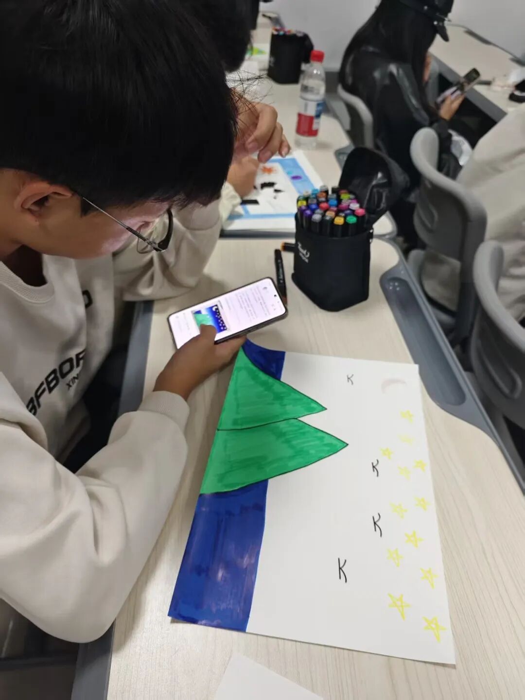 随后同学们将纸质画作交给AI工具,有人选择用AI优化画风,将原本简约的线条画,升级为水彩质感的柔和画面,让画作的艺术表现力更上一层楼;也有人尝试用AI生成动图,让笔下静态的花朵绽放、飘动的云朵游走,让原本定格在纸上的创意“活”了起来。