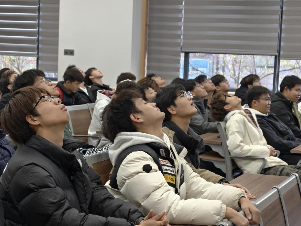 为帮助同学们将理论知识转化为实用的压力调节技能,讲座后随即开展了放松团体训练。郭思含老师用心理干预技巧,带领同学们进行肌肉渐进式放松训练。她以舒缓的语速、清晰的指令,引导大家从头部开始,逐一对颈部、肩部、背部、四肢乃至脚部的肌肉群进行“紧绷 — 放松” 的交替练习:先集中注意力感受肌肉紧绷时的酸胀感,再缓慢释放压力,体验肌肉松弛后的舒适与轻盈。在郭老师的专业引导下,同学们闭上眼睛,专注于呼吸与身体感知,逐步卸下身心包袱,现场氛围宁静而治愈。这次放松训练帮助学生将长期积累的学业压力和焦虑情绪得到了有效舒缓,学会了简单易操作的自我放松方法。